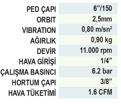 2,5 ORBİTAL 320 KUM ve 3000 KUM ARALIĞI İÇİN EN UYGUN SALINIMDIR.